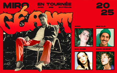 Après avoir tourné la belle province et l’Europe avec son spectacle ‘’Géant’’, Miro revient sur scène accompagné de Mike Clay, Simon Kearney, San James et Soraï, pour un spectacle complètement explosif ! Préparez-vous à découvrir une version 2.0 du spectacle Géant, magnifiée par des artistes exceptionnels, qui apportent une touche unique à l'univers musical de Miro.